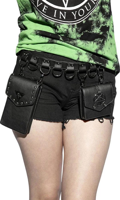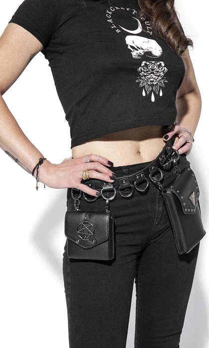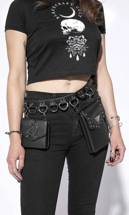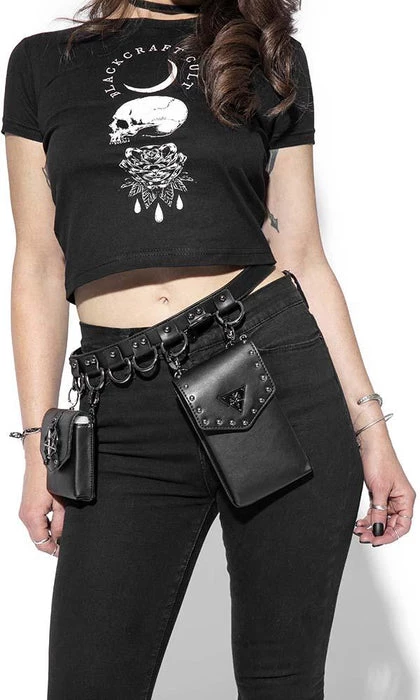 Faux leather multi belt bag features two adjustable/removable small faux leather goods. One is sized perfectly for a phone and the other for smaller items such as cards/ID. Features gunmetal finish Blackcraft logo hardware and studs. Additional D-rings on belt to attach your own accessories.