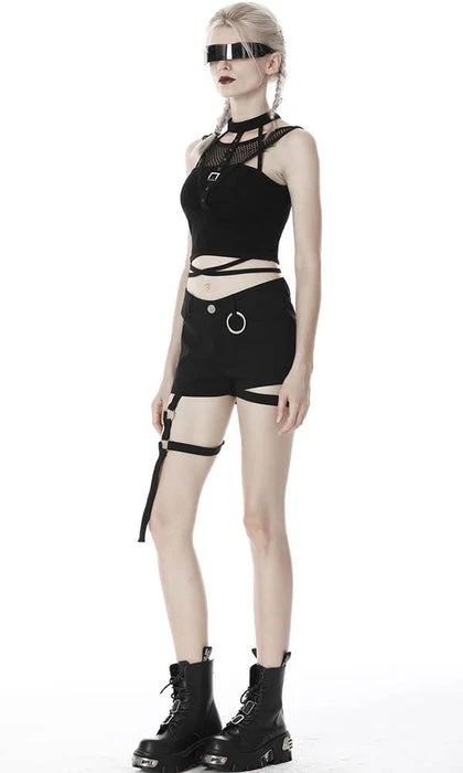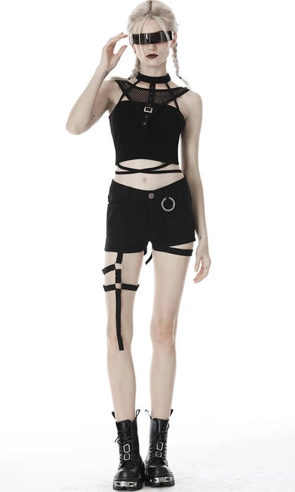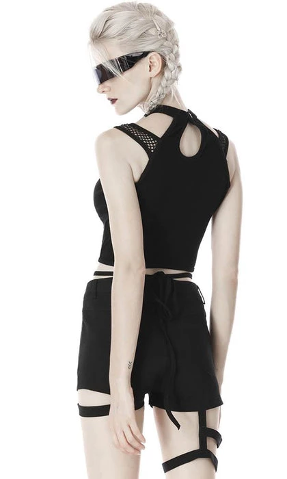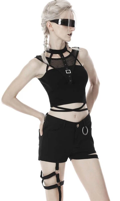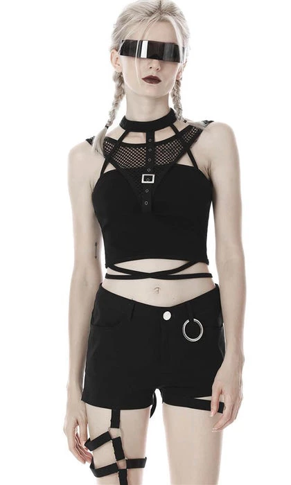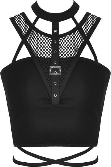 This incredible Splicing crop top is a perfect staple in any dark wardrobe! It features a mesh upper, attached to a collar and punky straps! Add your favourite pleated skirt and boots and you’re ready to dominate!
