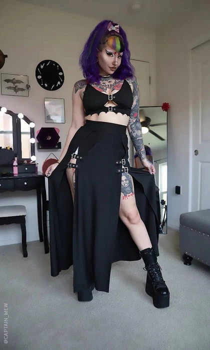 This skirt features buckle details throughout and soft stretch fabric. It pairs perfectly withΒ favorite top and stompy boots for a killer summer look!Β Β
