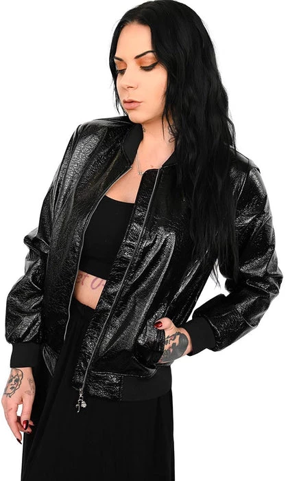 We love a statement bomber jacket. This one is made of a soft texturedΒ faux leather.