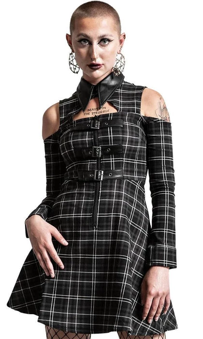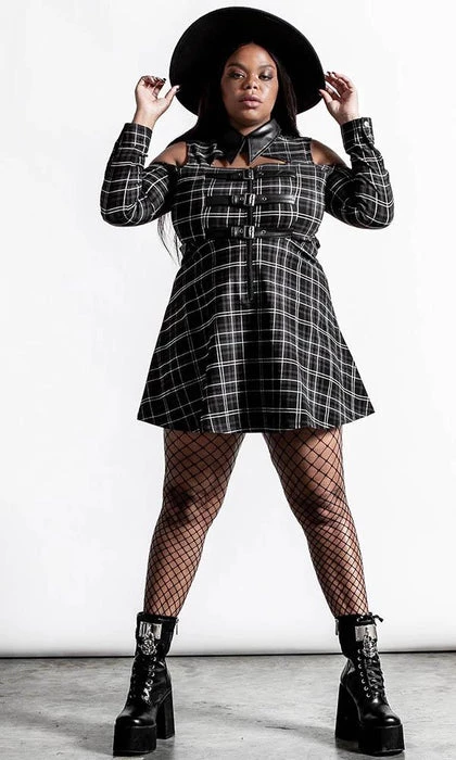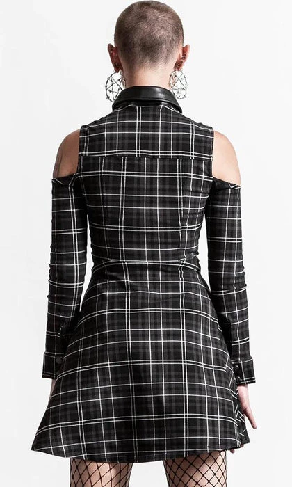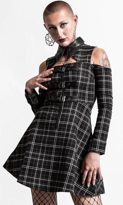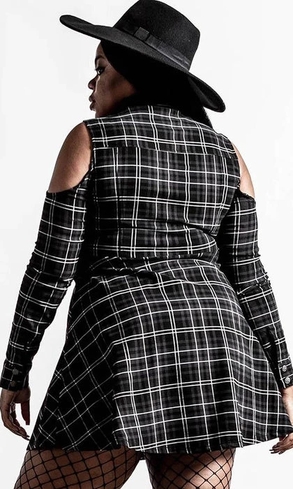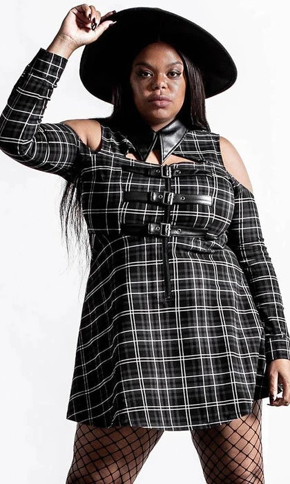Turn heads in the ‘Chaotica’ ash tartan shirt-dress. Conjured using a super stretch woven material for a comfortable yet flattering fit. Features cold shoulders, a bold collar, cut-out chest and buckle detailing at the front with a zip. This angsty statement piece is perfect for nights out with friends!