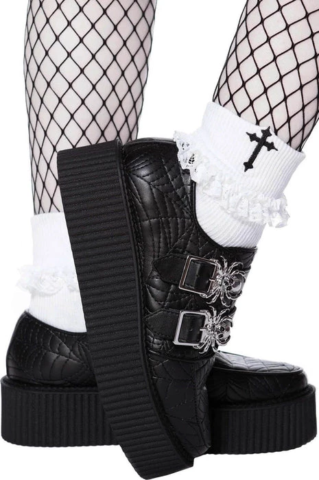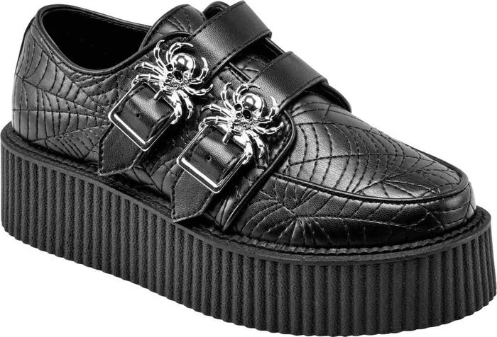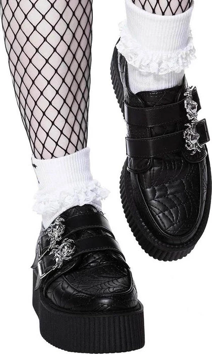 The Dead ‘n’ Buried creepers areย madeย in a high-quality vegan leather body, with straps to the front, silver hardware and statement spiderweb pattern. Leather piping details and complete with a 5cm platform sole. Ready to rock with your coven, nights out, or just doing day-to-day stuff out the crypt.