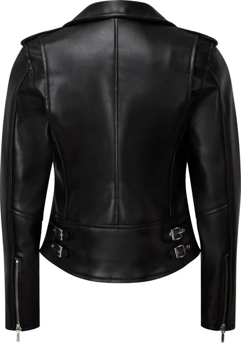 Classic fitted biker jacket in A-Grade faux leather, with all-black satin lining – a simple style that fits in with everything. Hand-crafted.