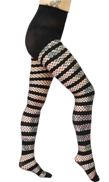 Fishnet tights with opaque stripes, a classy yet cool combination- perfect for any outfit!