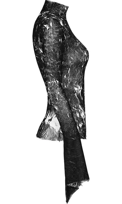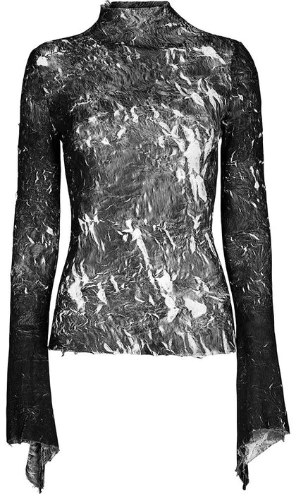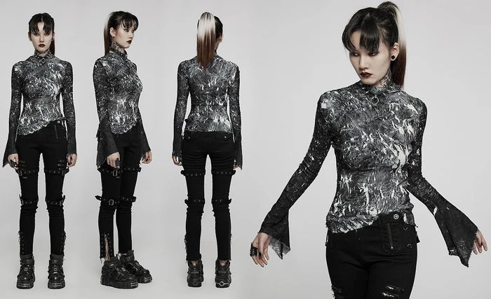 This stunning lightweight monochromatic turtleneck top features flared sleeves, a high neckline and a marbled design! Pair this stunning top with a pair of bondage pants and some sick combat boots to complete this look!
