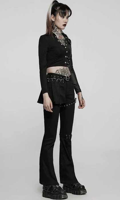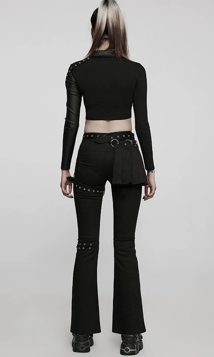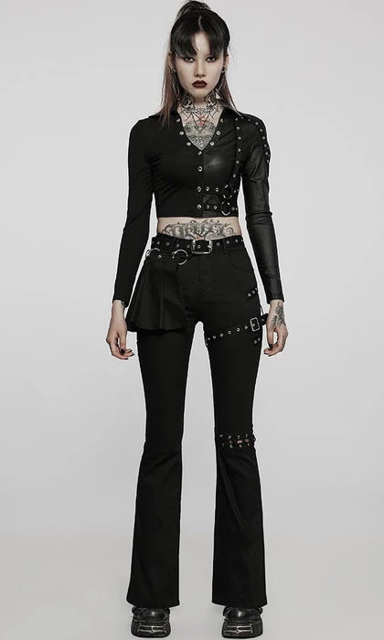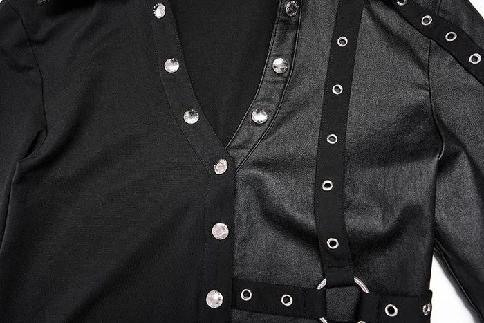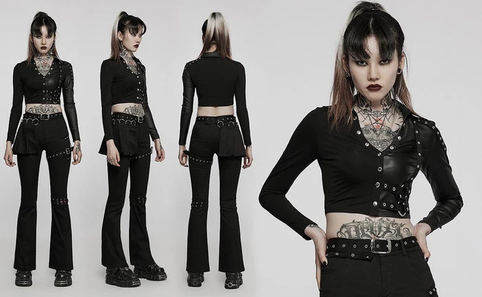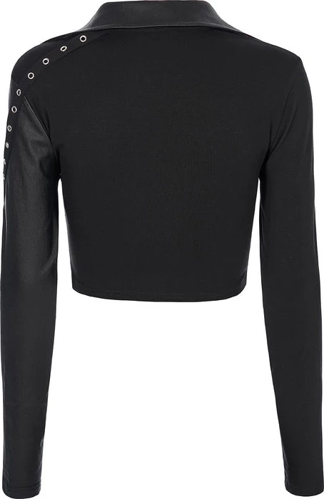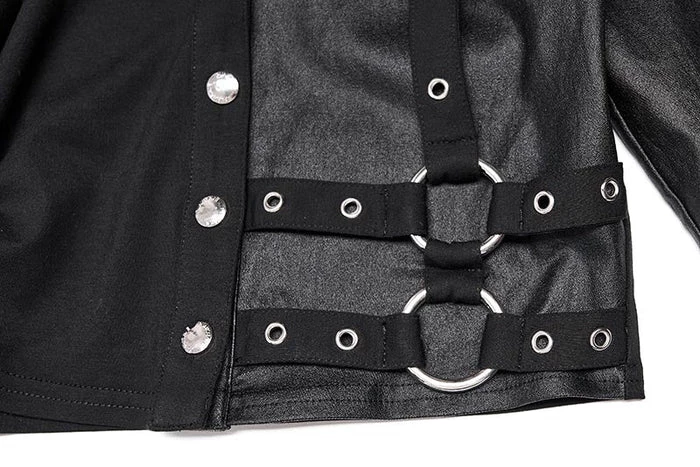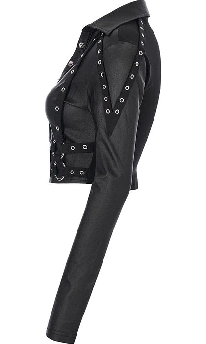 Give us those Dominatrix vibes with the Gloriella top! This sexy top features a faux leather side with harness detailing and studs in a fitted, cropped style! Pair this top with a short skirt or bondage pants for a super hot look!ย