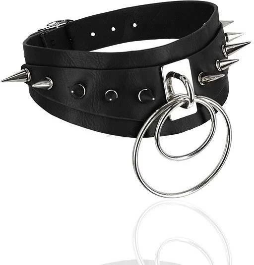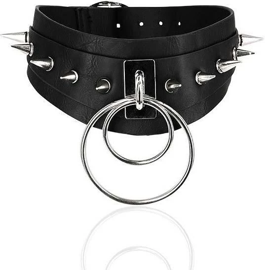 Add definition to refined edits with this Double Spiked choker. It’s crafted from textured black Pu leather (100% vegan). The structural piece is punctuated by a metal spikes and Double Ring statement piece. It has a silver metal buckle on the back. Let the classic gothic design be your go-to choice for refined finishes.