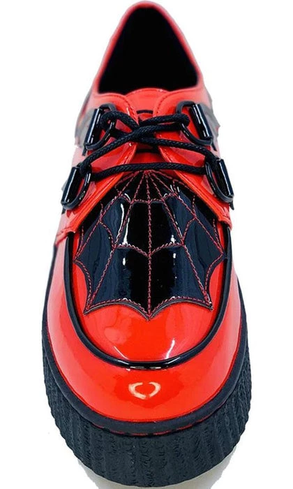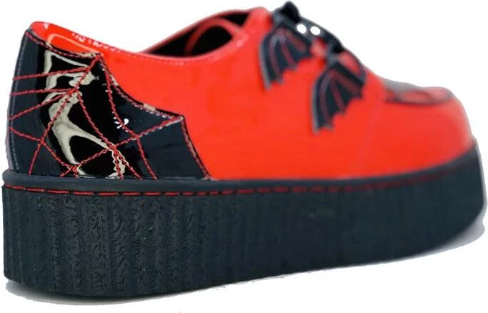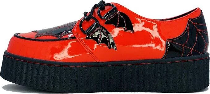 Get caught in these webs! These spooky Red Creepers feature a large black web design on the front & back and cute bat wing detailing!