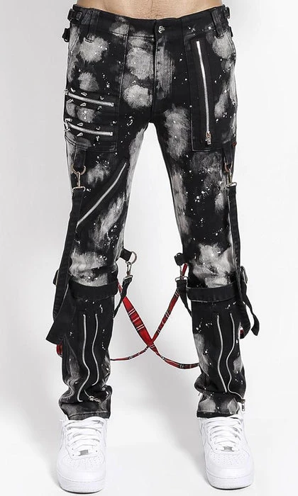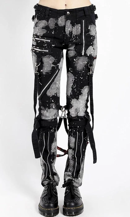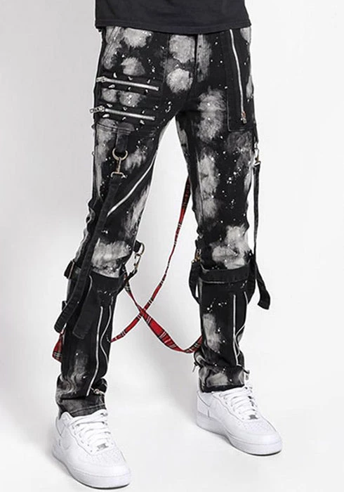Imagine the chaos you could stir up in these bleached skinny fit pants featuring removable plaid straps, studs, and exposed zippers! Pant legs can be zipped for a change in fit, topped off with a zip fly and button closure.