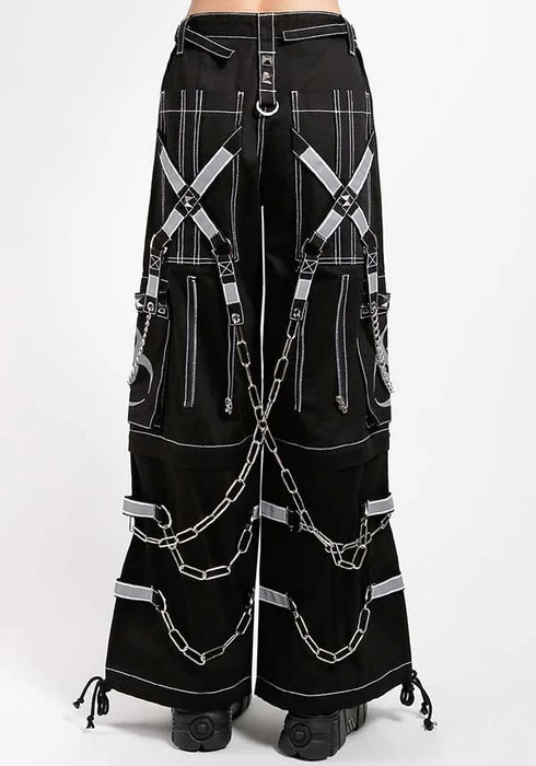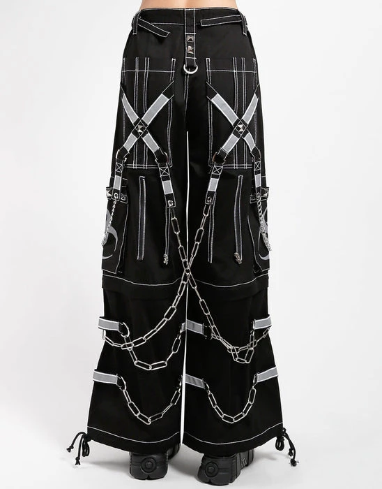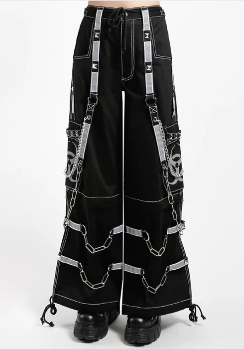 Catch everyone’s eye with the Biohazard Black/Reflective Pants. These pants have reflective strips and two different style chain links embellished on the front and back. Pair these with a tight top or a pair of stomping boots for a toxic night out.
