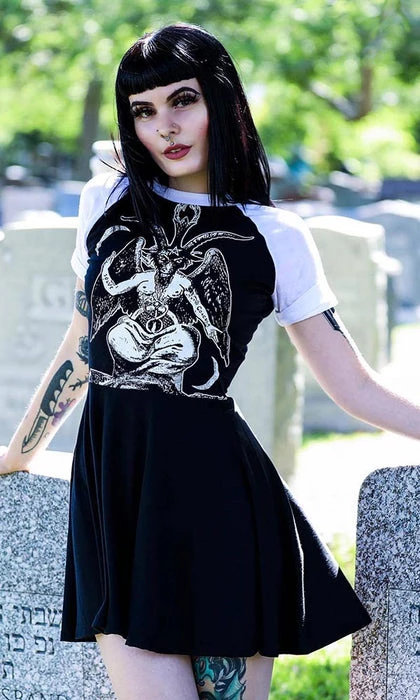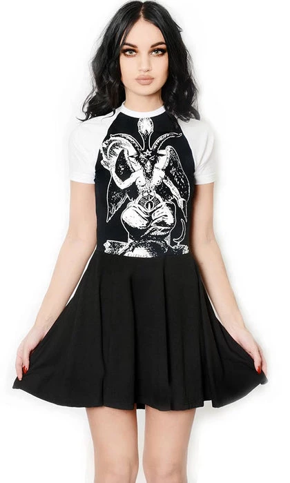 Add some edge to your wardrobe with the Baphomet Baby Doll Dress! Handmade from an altered mens shirt, this professionally sewn super soft dress features short baseball style sleeves, a round neckline and a contrasting Baphomet print. Style withย thigh high socks and chunky boots for a casual goth look.